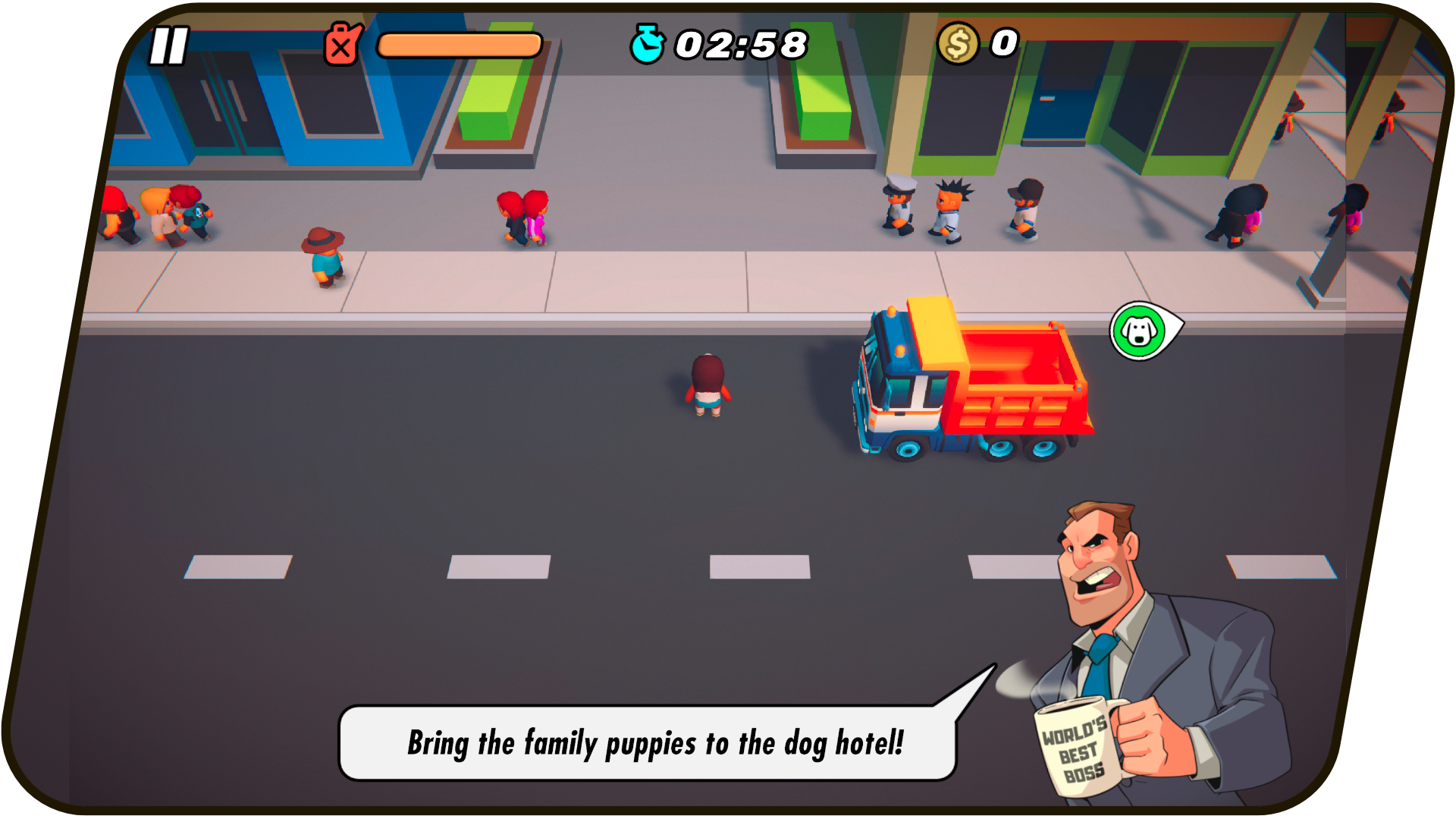 An arcade rampage where you work for a grumpy dog-kennel boss. |